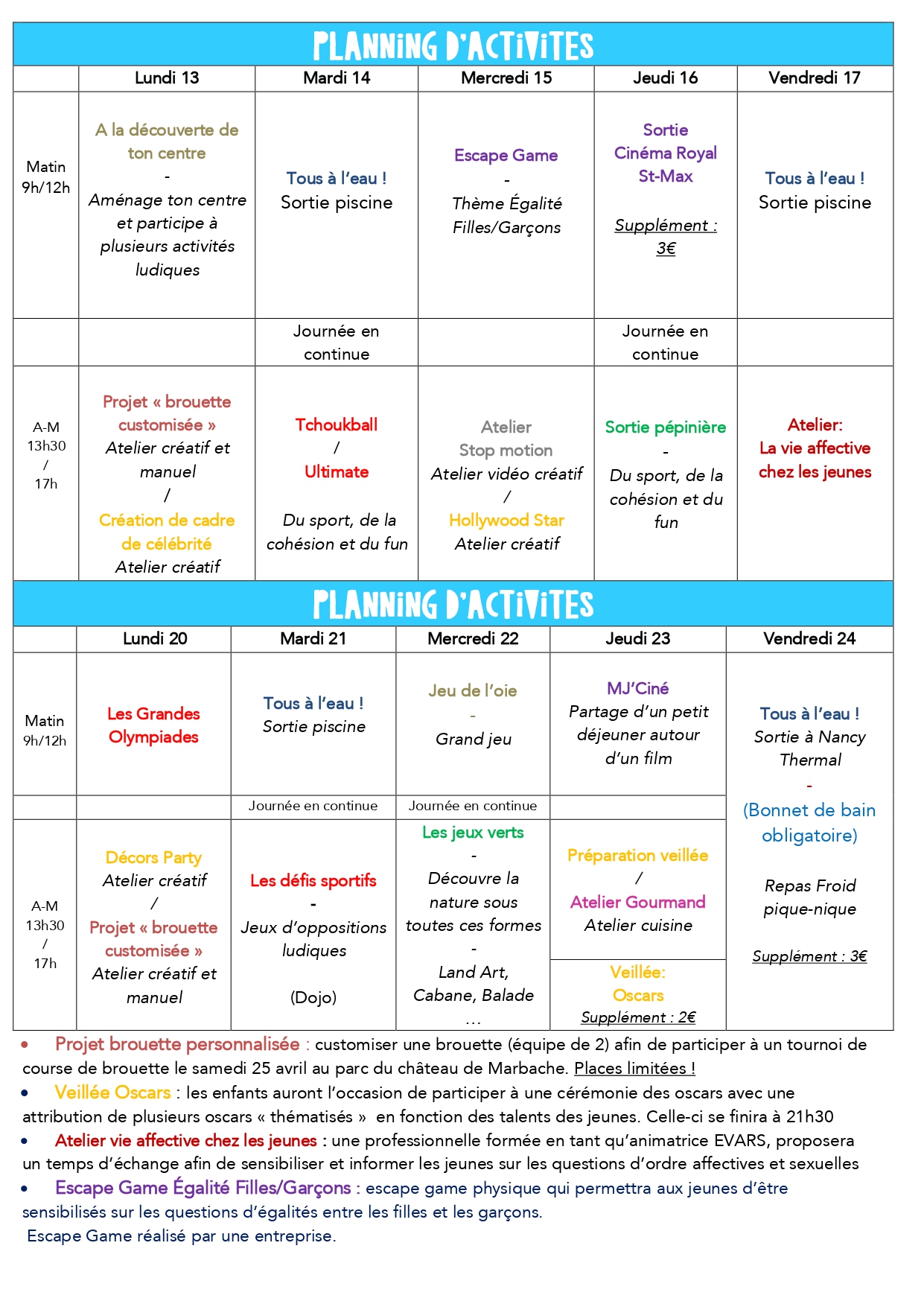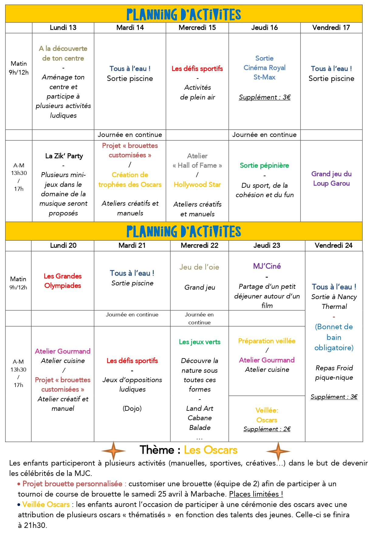 PLANNING DES ACTIVITÉS DES 12/15 ANS